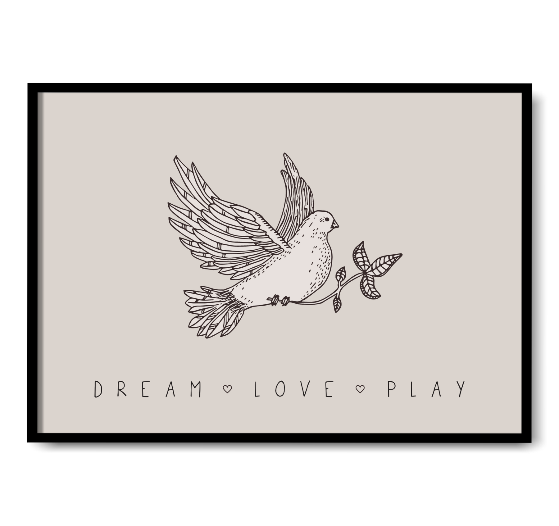 Barn affisch med duva mot en ljus beige bakgrund i fin bohemisk stil. Texten Dream, love, play dekorerar illustrationen i nederkant