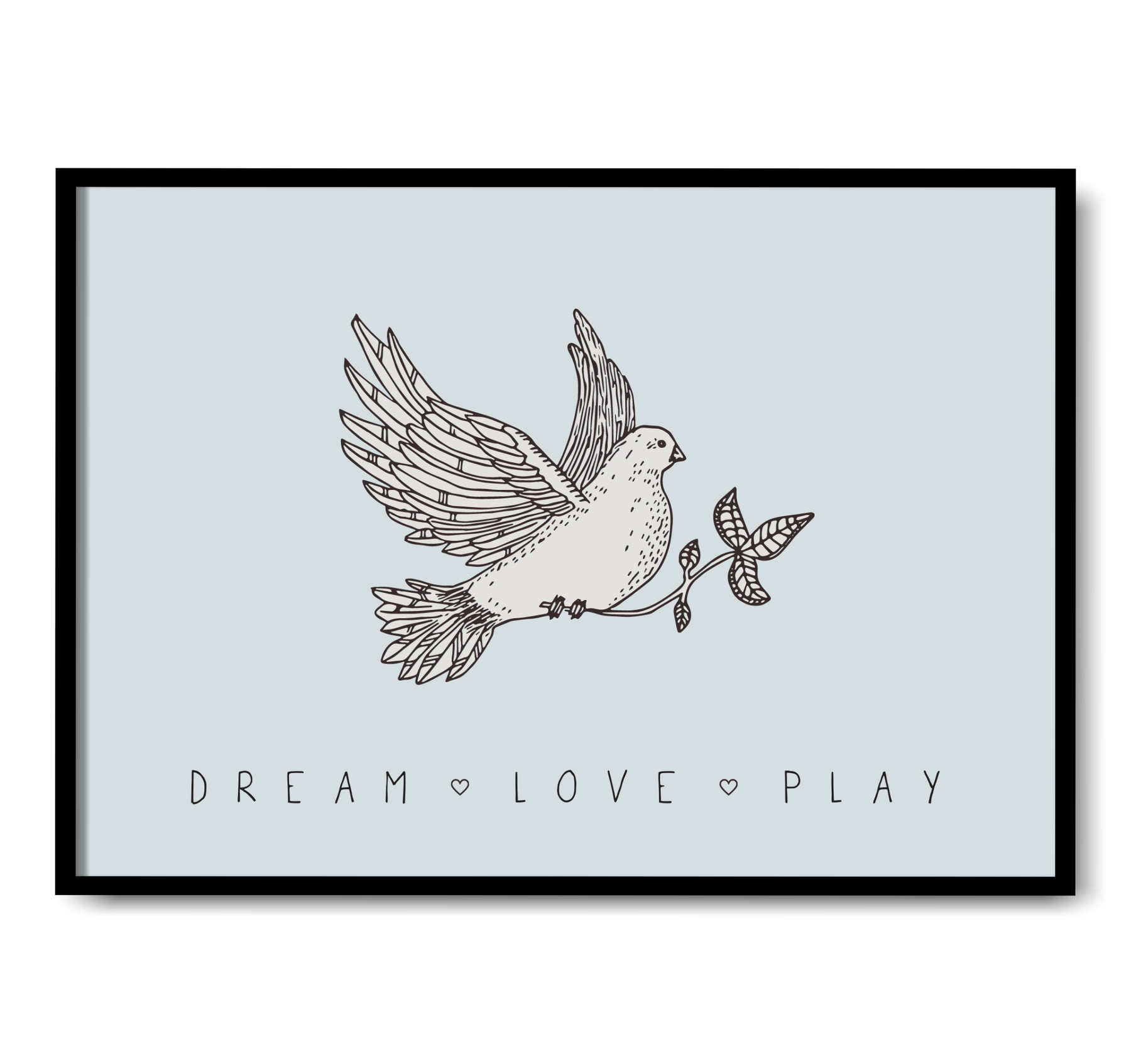 Barn poster med illustration av en duva mot en ljusblå bakgrund. Texten Dream, love, play dekorerar illustrationen i nederkant