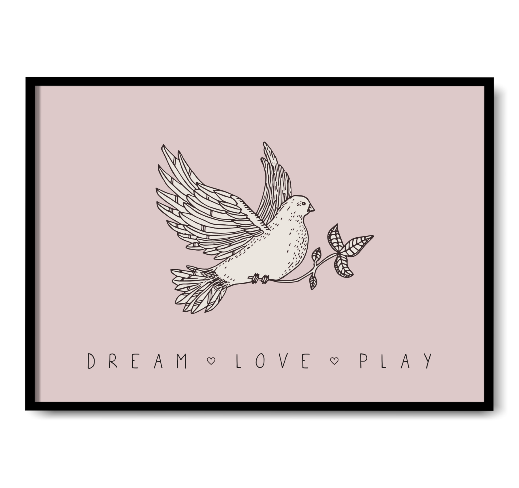 Barntavla med duva mot en puder rosa bakgrund. Texten Dream, love, play dekorerar illustrationen i nederkant