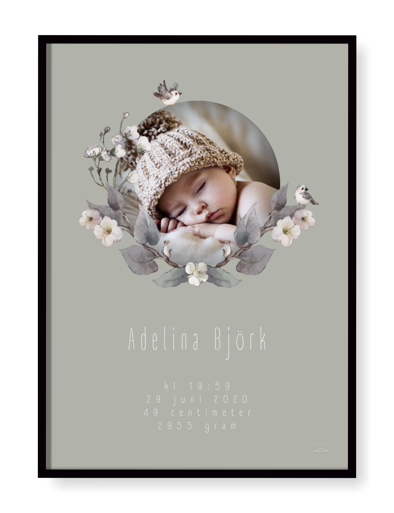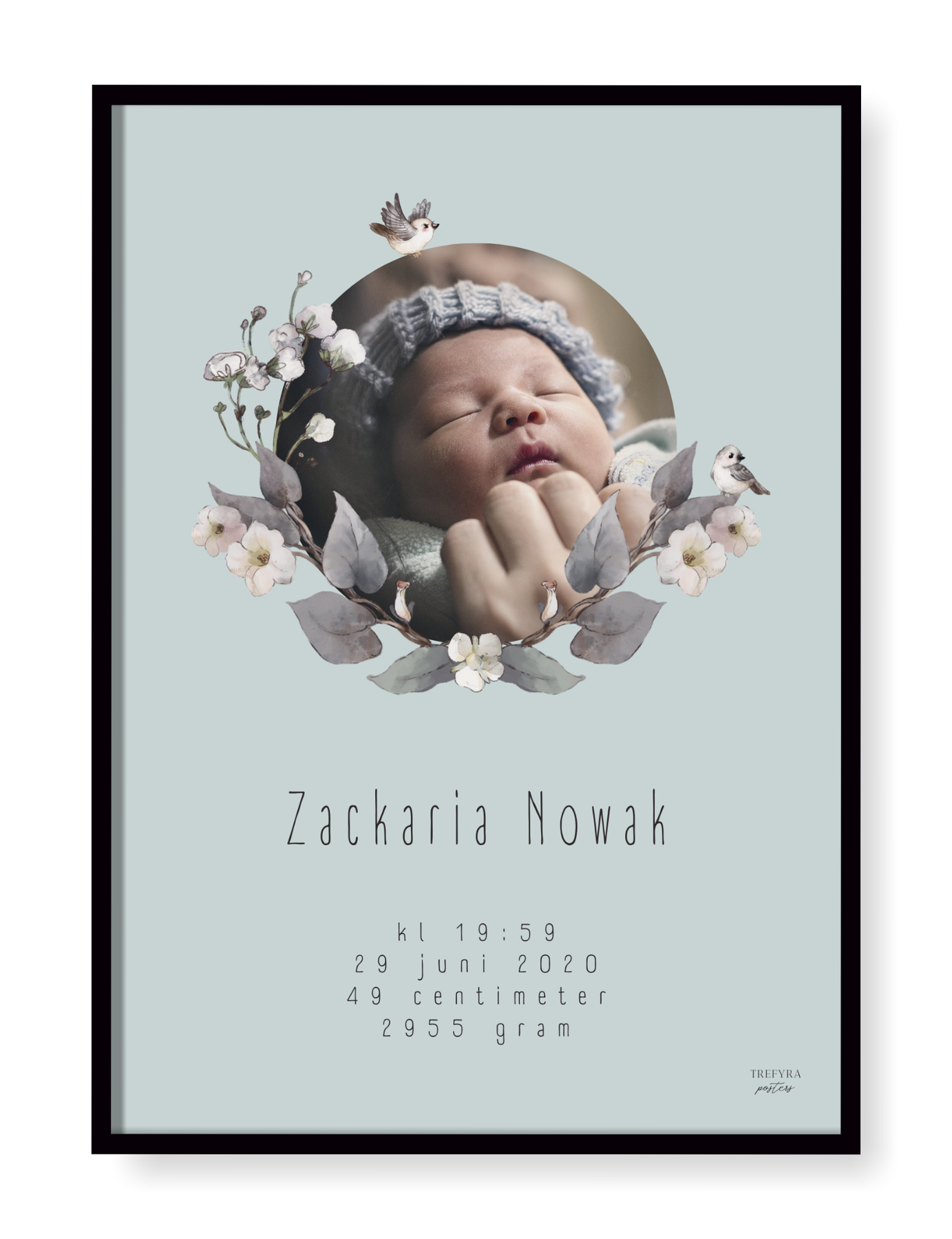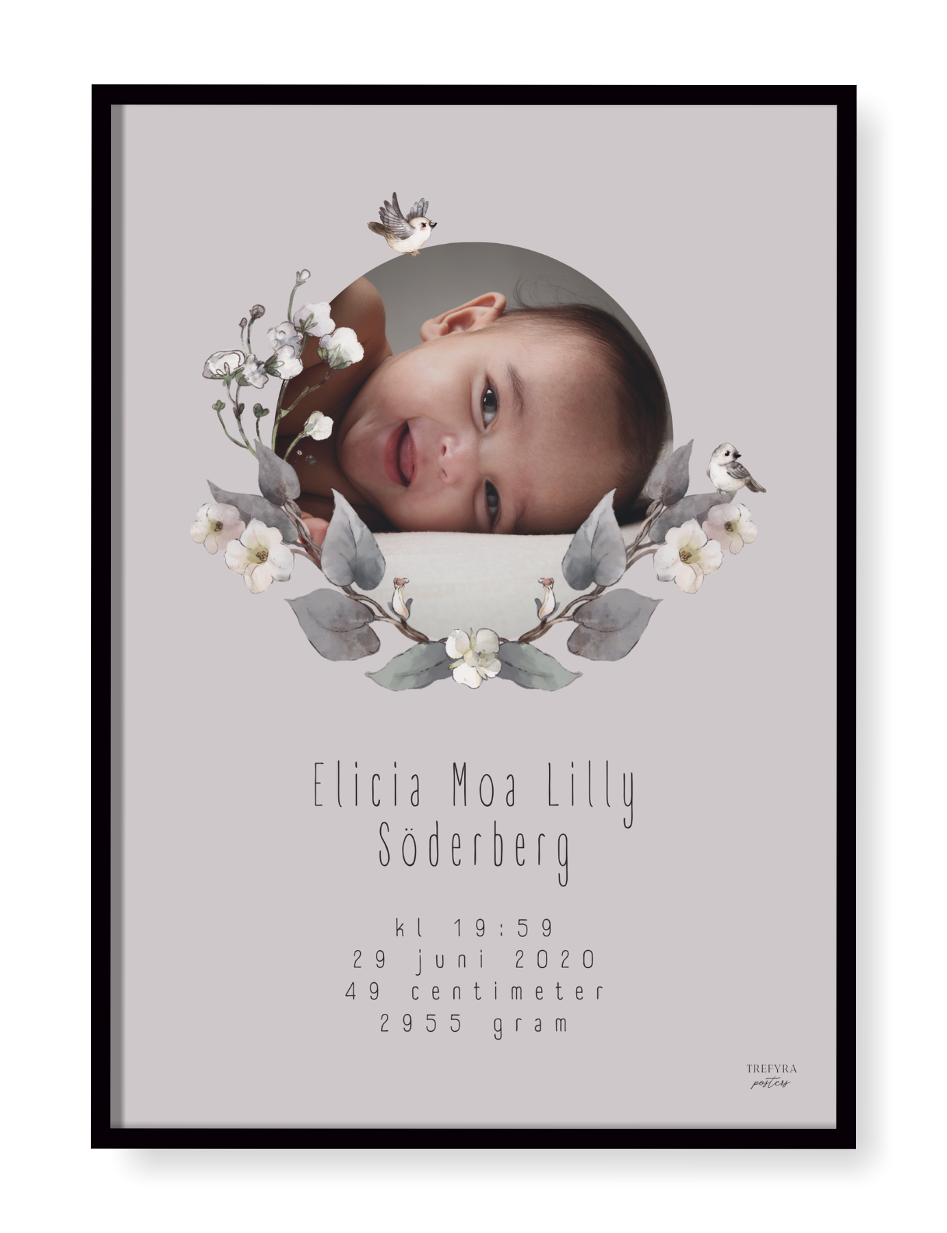 Underbar födelsetavla med egen bild som vackert hyllar ditt barns födsel. Här väljer du bakgrund efter smak och vi kan lova att varje är fin och unik på sitt sätt.