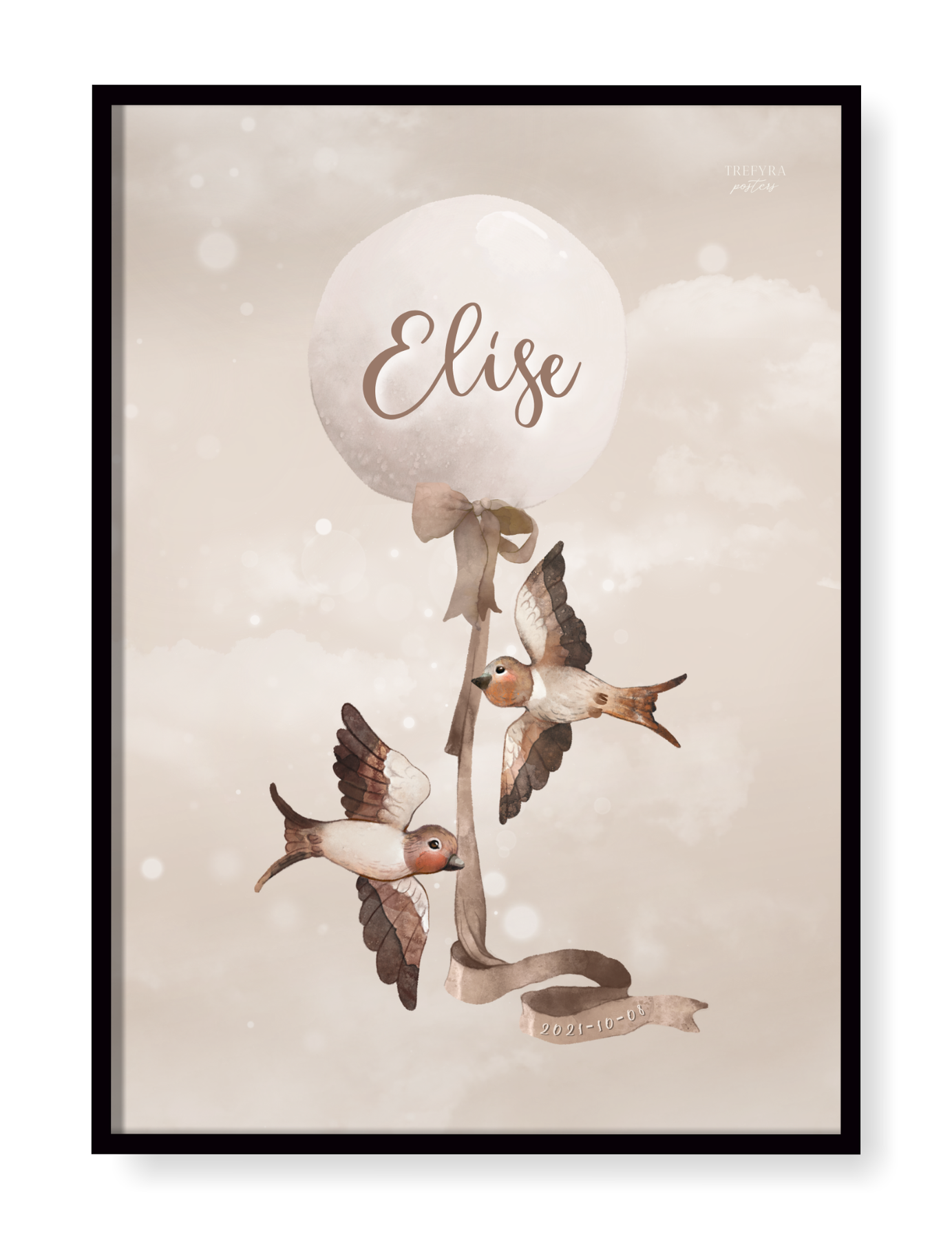 En enkel men väldigt fin födelsetavla från kollektionen Tranquil dreams där barnets förnamn och födelsedatum finns skrivet.