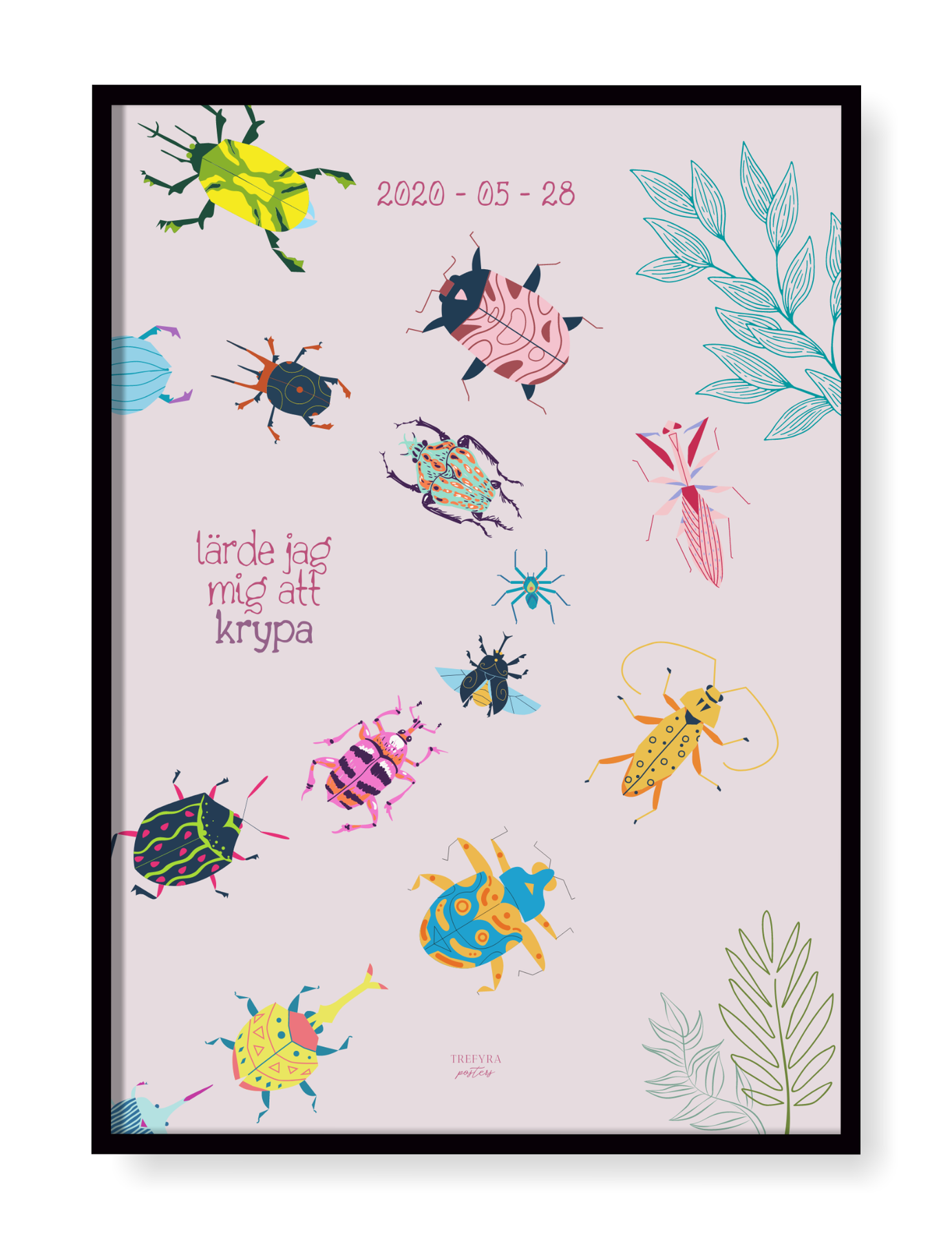 Personlig och barnsligt rolig poster med färgglada kryp där vi skriver in datumet då din lilla kämpe började krypa.