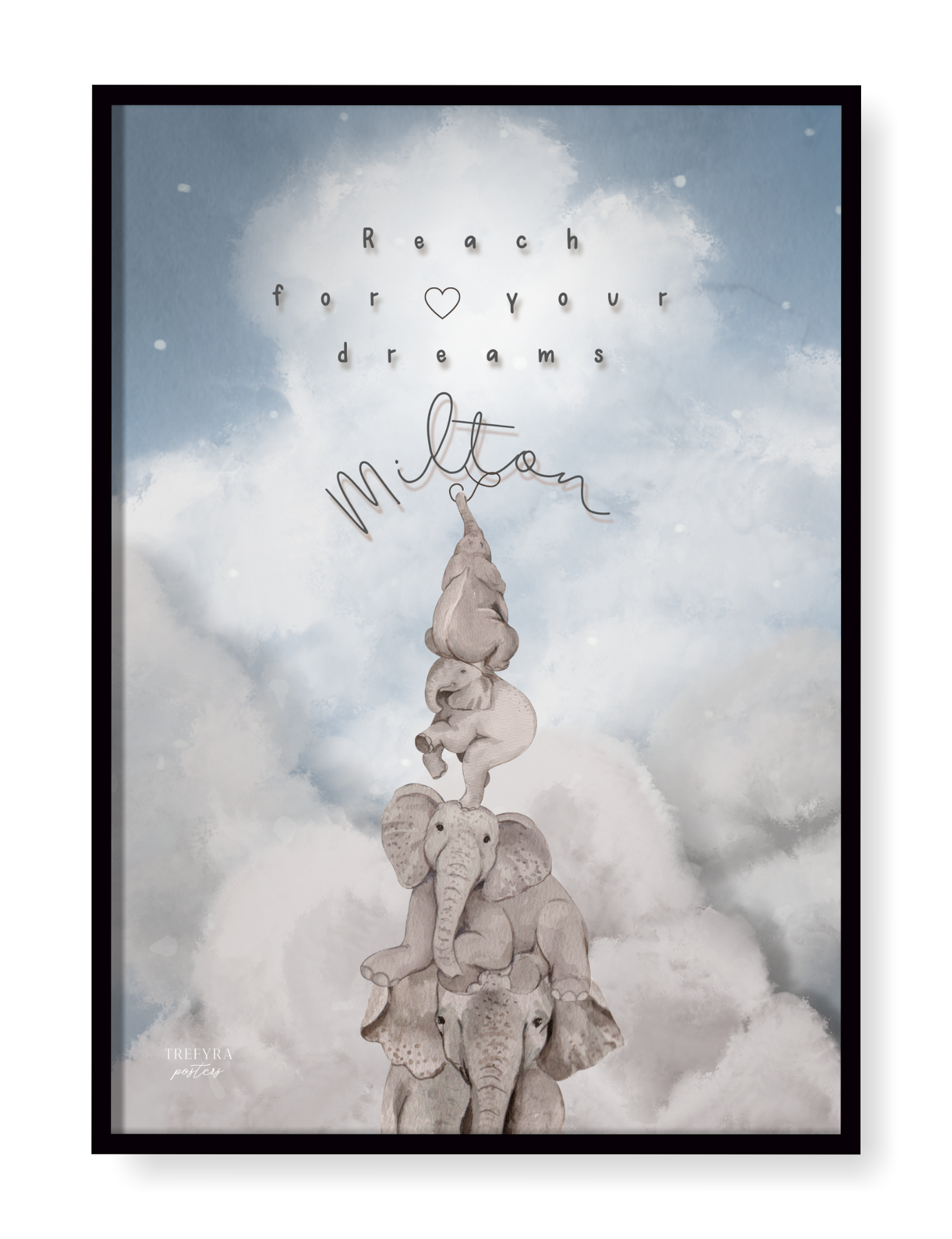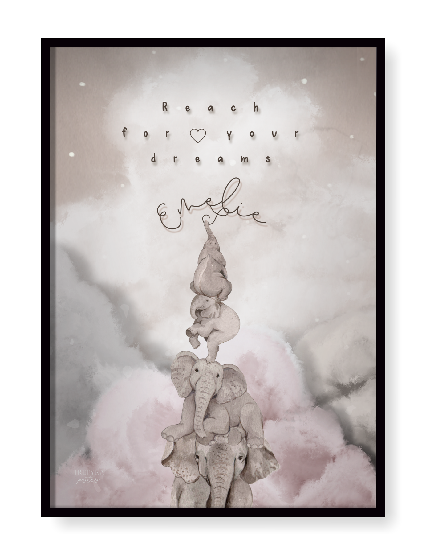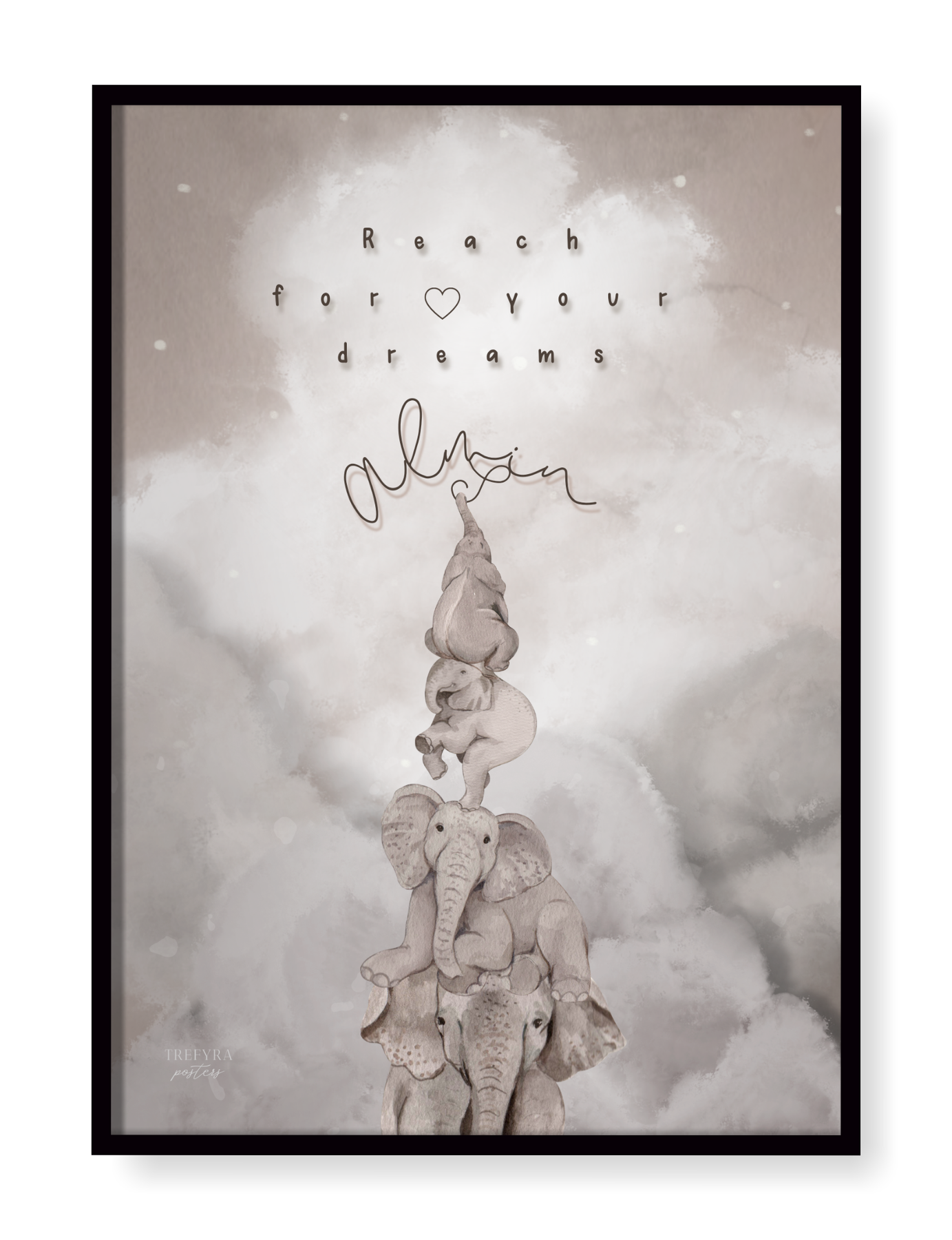 En personlig poster där vi skriver in barnets namn på "namnskylten" som elefanten håller i. Skapa en fin gåva till ett kärt barn och låt den bringa inspiration och magi till tillvaron.