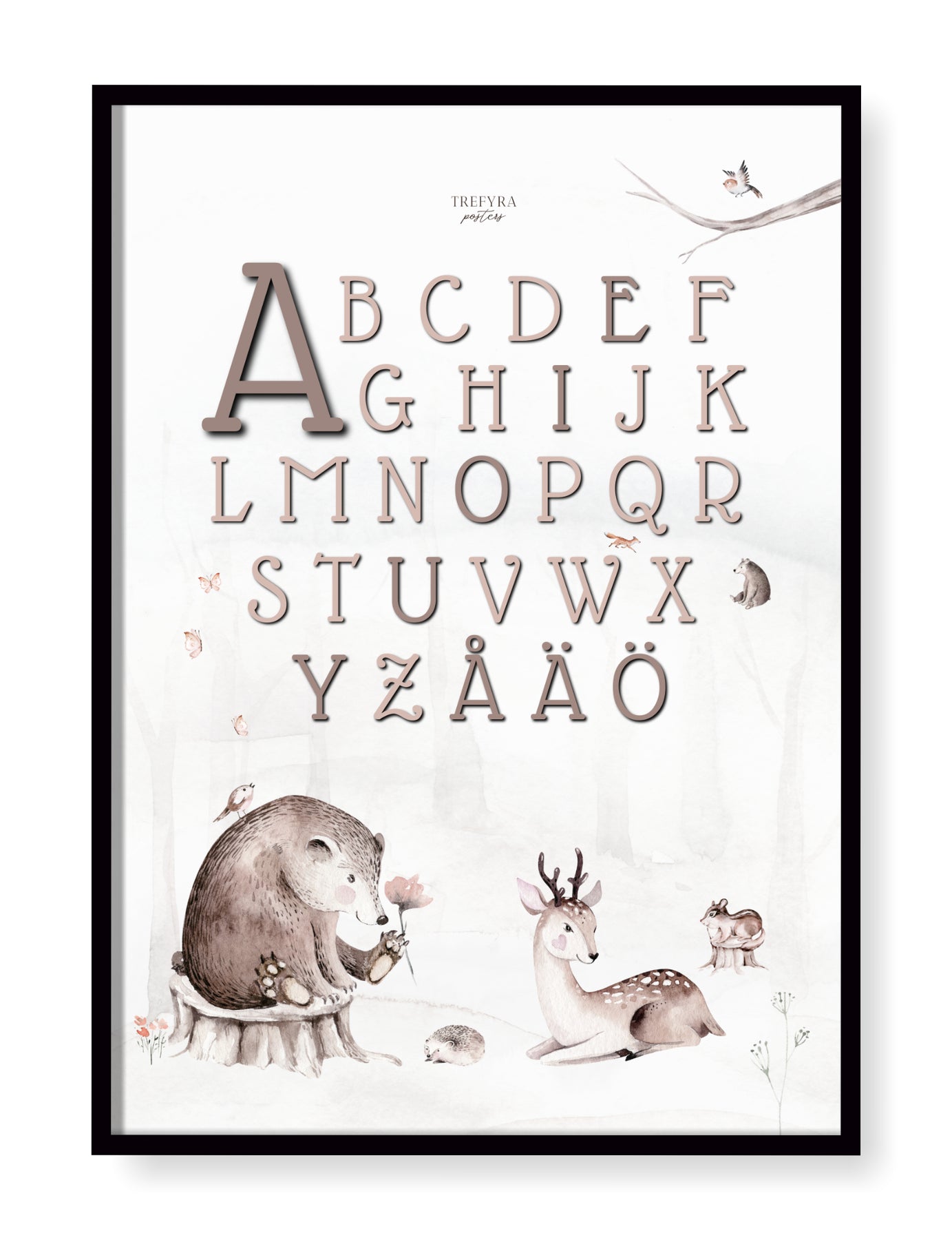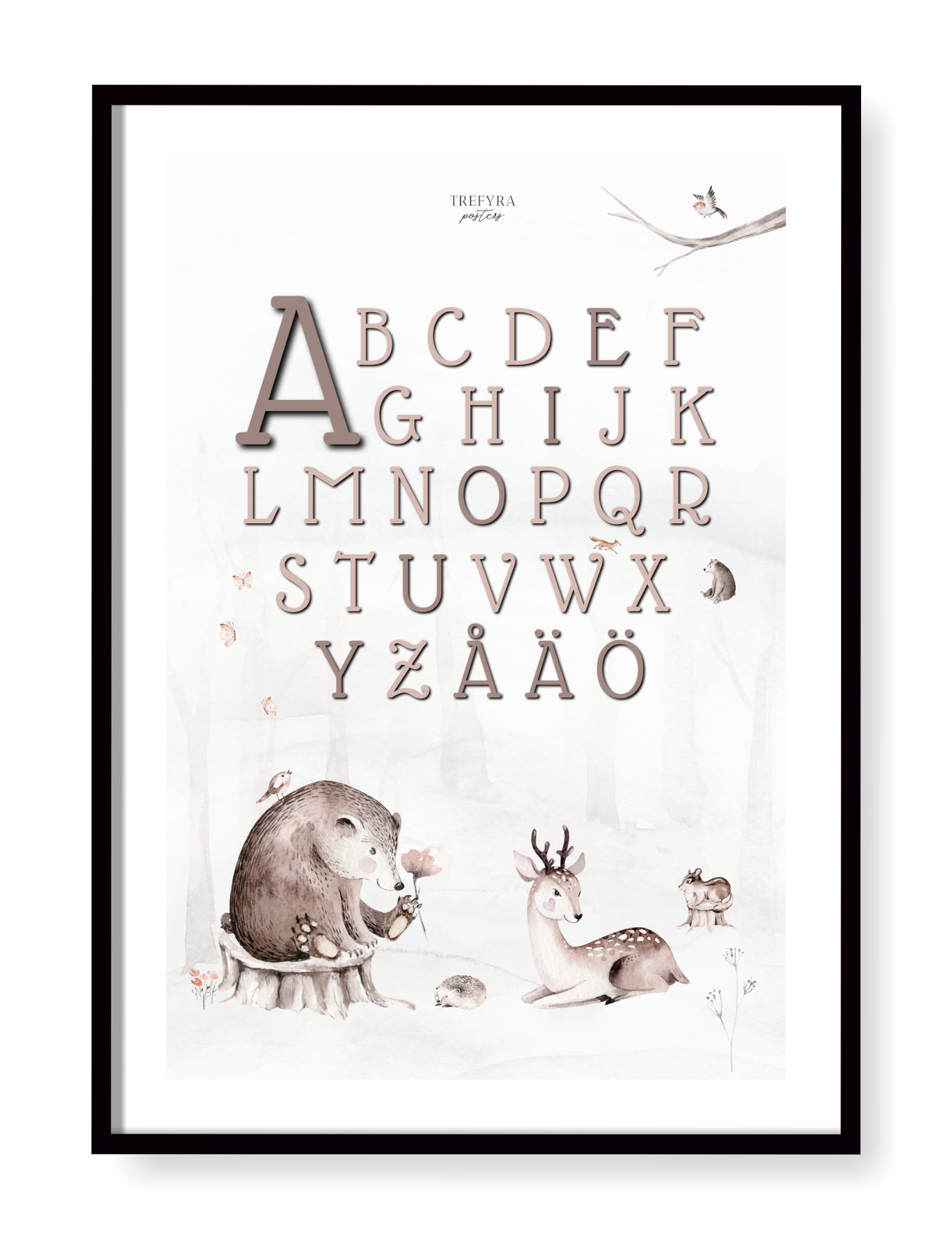Alfabetspostern i temat Skog II är en barnposters som andas lugn och visar på en harmonisk och magisk natur i jordiga och neutrala färger.