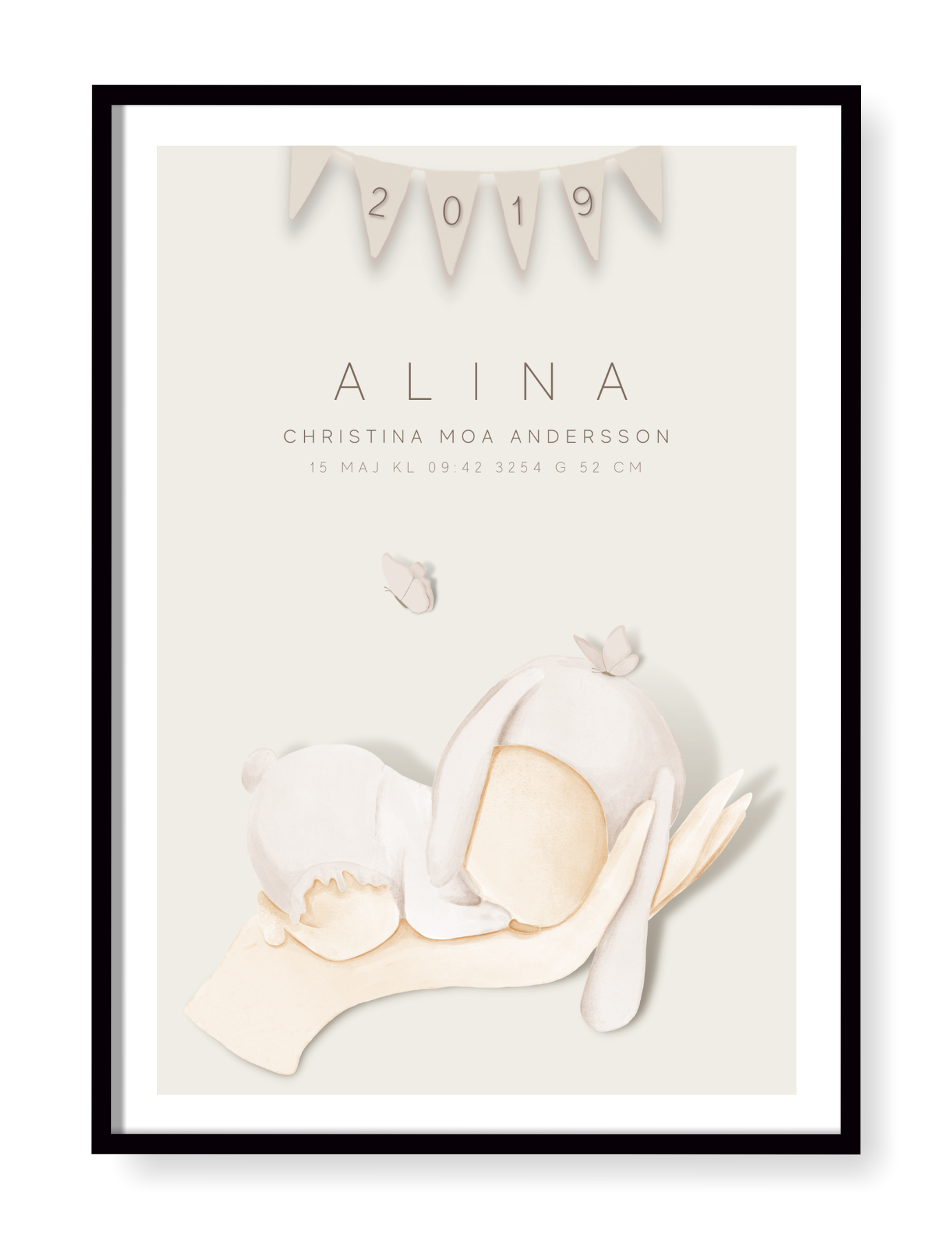 Här skriver vi barnets födelseår i vimplarna och resterande födelseuppgifter tillsammans med barnets namn undertill. Se gärna närbilden.
