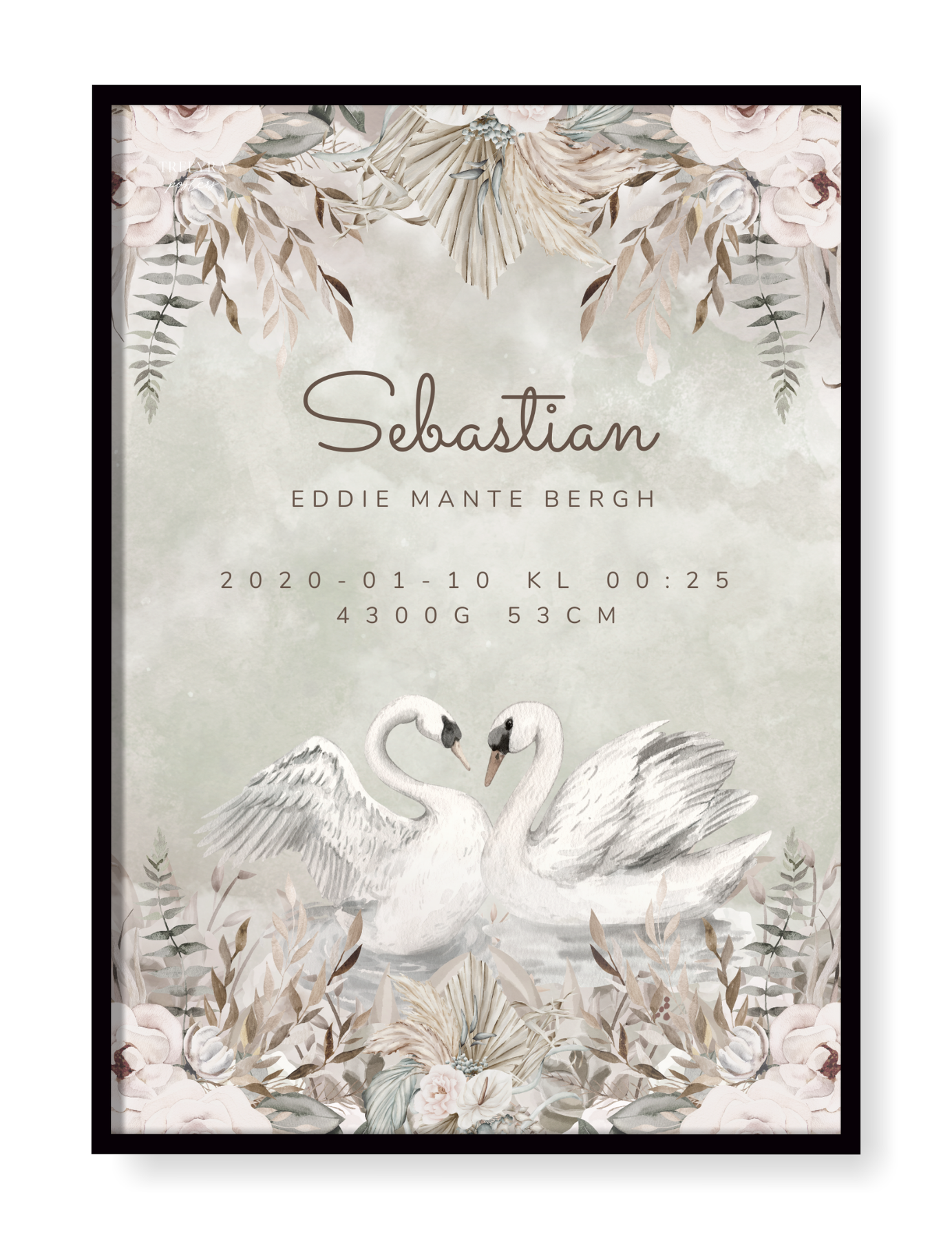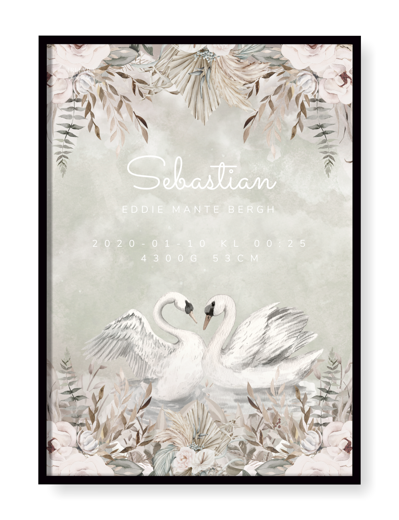 Underbar födelsetavla för dig som gärna inreder med mjuka och lugnande färger med en klick magi! Här bjuder svanarna på en ytterst mysig och harmonisk poster i akvarell med mjuka och tonade färger. Hylla dagen ditt älskade barn föddes!